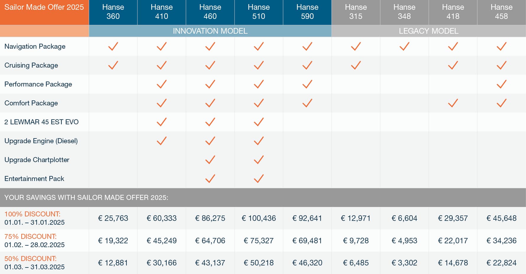Yeni Hanse'nizin temellerini atmanın en akıllıca yolu bugünden başlamaktır. Yatınız sadece sezon sonuna kadar veya daha erken teslim edilmekle kalmayacak, aynı zamanda son derece uygun fiyatlı ekipman paketleriyle de teslim edilecektir. Bunları, tutkulu denizciler ve lider bir üretici olarak Hanse yatınızın konforunu ve performansını artıran tüm uzmanlığımızla bir araya getirdik. Hayalinizdeki yatı yukarıdaki listede görüyorsanız, dünya çapındaki 100'den fazla profesyonel bayimizden biriyle hemen iletişime geçin.