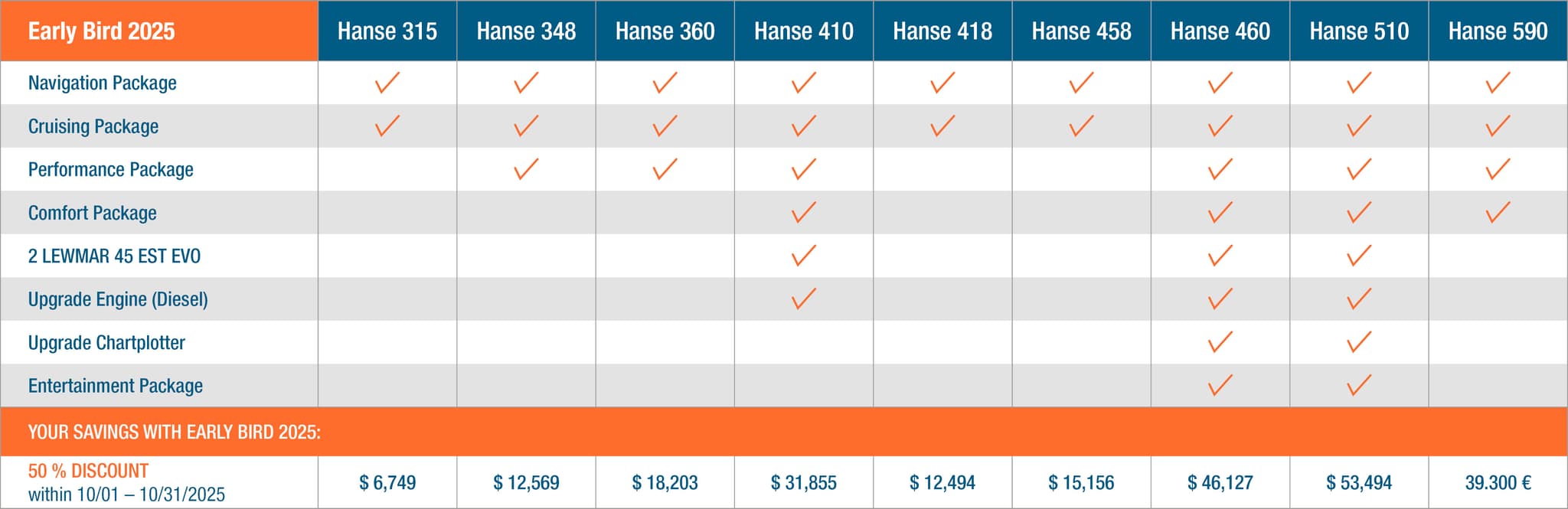 (*) Disclaimer: Maximum price advantage based on the Hanse 510, available until the end of October 2025 for yachts to be delivered most likely not before November 2025, individual may earlier. May not selected options won't be refund. This special offer cannot be combined with any other price promotions or incentive programmes. Errors excepted.